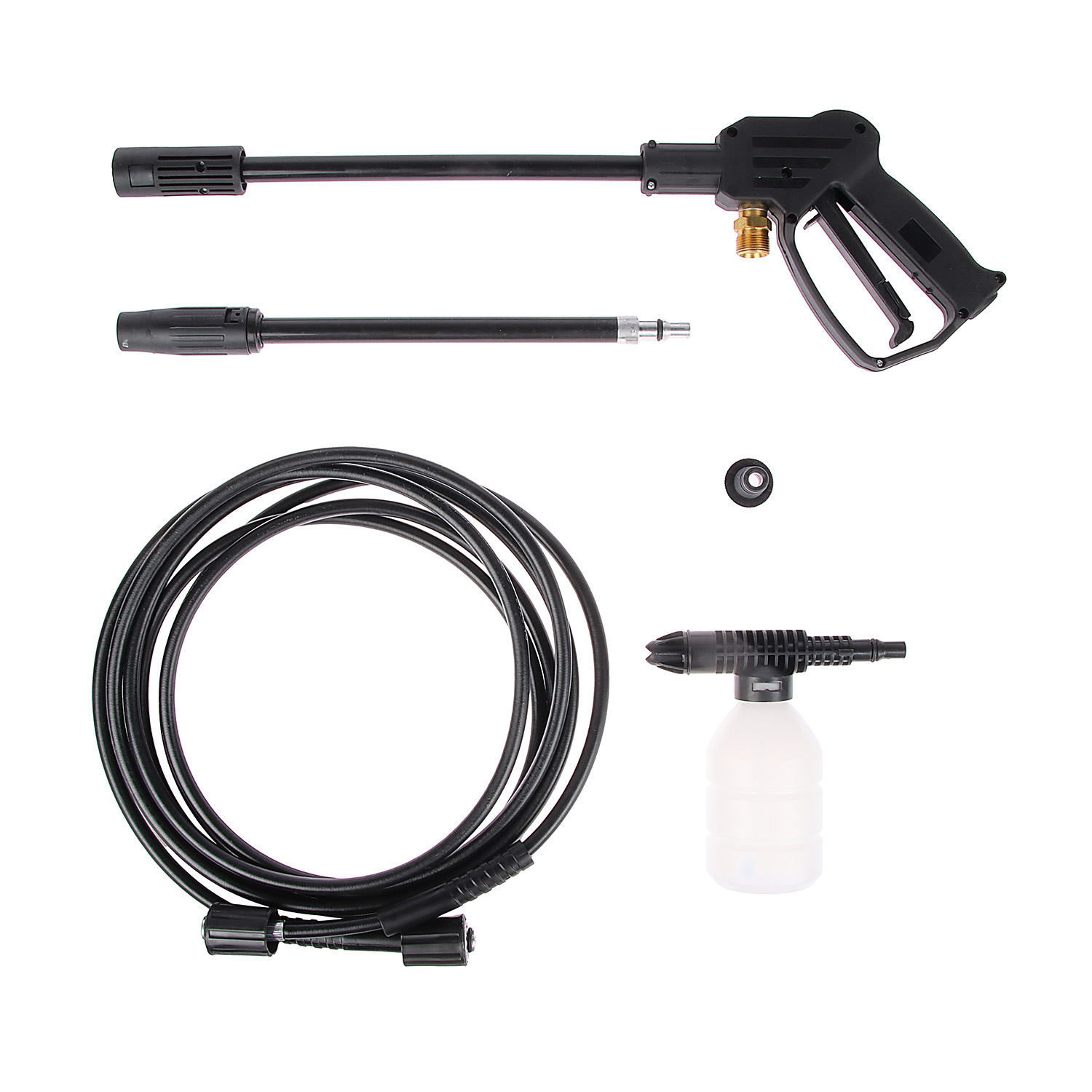 Мойка, шланг высокого давления, пистолет, направляющая трубка, трубка- распылитель, крепление трубки, подставка для трубки, штуцер для шланга, бачок для моющего средства, верхняя рукоятка, набор для чистки форсунок, набор крепежа, инструкция по эксплуатации |