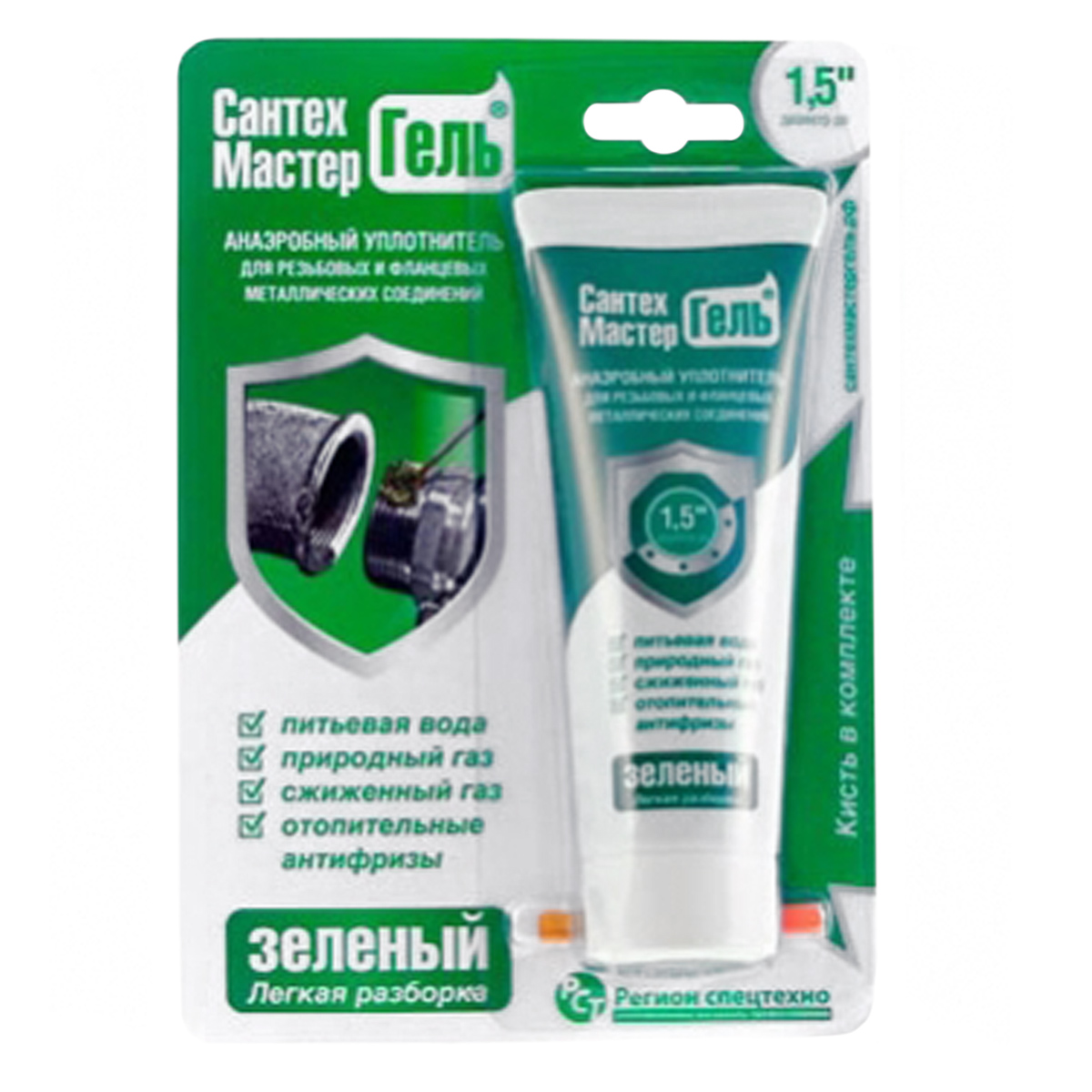 СантехМастер Гель Зеленый 60 г — это резьбовой герметик для металических соединений, созданный для легкого демонтажа соединений, которые располагаются в тяжело доступных местах, где невозможно использовать иные уплотнительные материалы. Он разработан для быстрой и качественной герметизации металлических фланцевых и резьбовых соединений. Данный гель-герметик разработан для труб диаметром до 1,5 дюймов. Соединение, собранное с использованием СантехМастер Гель Зелёный поддается легкому демонтажу без применения нагрева. Время полимеризации: 20 - 30 мин Температура монтажа: от + 18 °С Рабочая температура: от - 60 до + 150°C Демонтаж: Облегчённый ПРЕИМУЩЕСТВА НАД ДРУГИМИ ТЕХНОЛОГИЯМИ:-Герметизация без использования льна.-Защита соединения от коррозии за счет высокой адгезии геля к материалу резьбы.-Отсутствие усадки и расширения при отвердении.-Простота монтажа.-Отсутствие риска засорения фильтров и узких проходов.-Устойчивость к ударам, перепадам температур и давления.-Стойкость в различных средах.