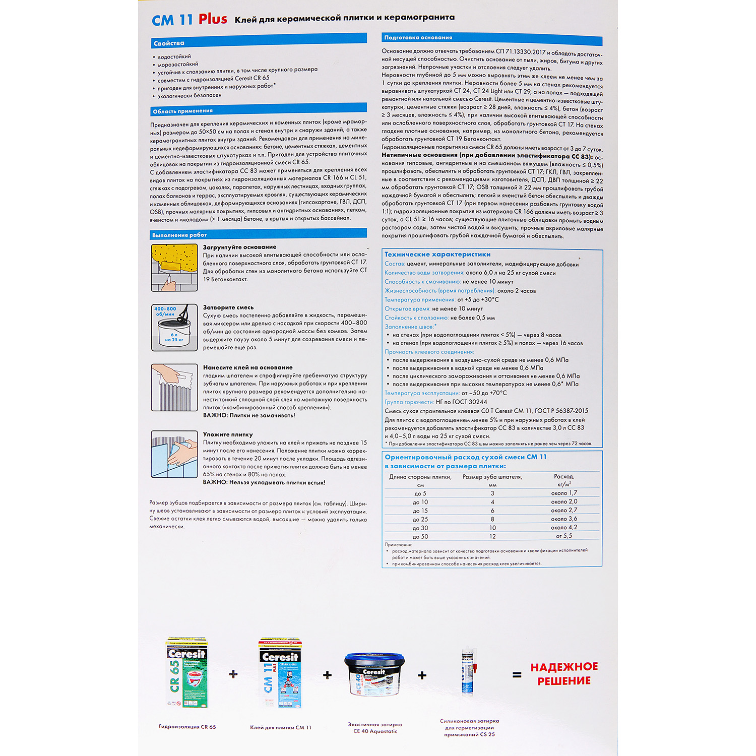 Предназначен для крепления керамических, керамогранитных и каменных плиток (кроме мраморных) размером до 60×60 см на полах и стенах внутри и снаружи зданий. Рекомендован для применения на минеральных недеформирующихся основаниях: бетоне, цементных стяжках, цементных и цементно-известковых штукатурках.