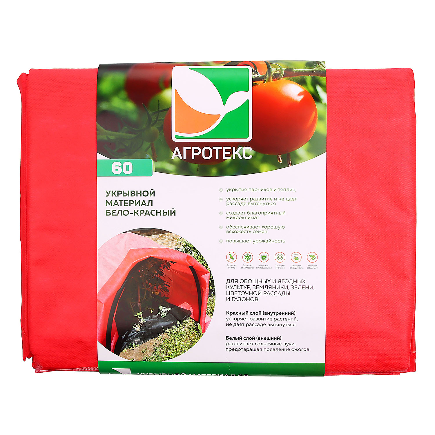 Укрывной материал 2-х слойный Агротекс ускоряет развитие и не дает рассаде вытянуться. Подходит для выращивания: зелени, рассады овощей (огурцов, томатов, перцев), земляники, газонов, цветочной рассады. Бело-красный укрывной материал – ускоряет развитие, защищает от ожогов, не дает рассаде вытянуться. Внутренний красный слой обеспечивает спектр света, ускоряющий рост, а внешний белый – рассеивает солнечные лучи, предотвращая появление ожогов.