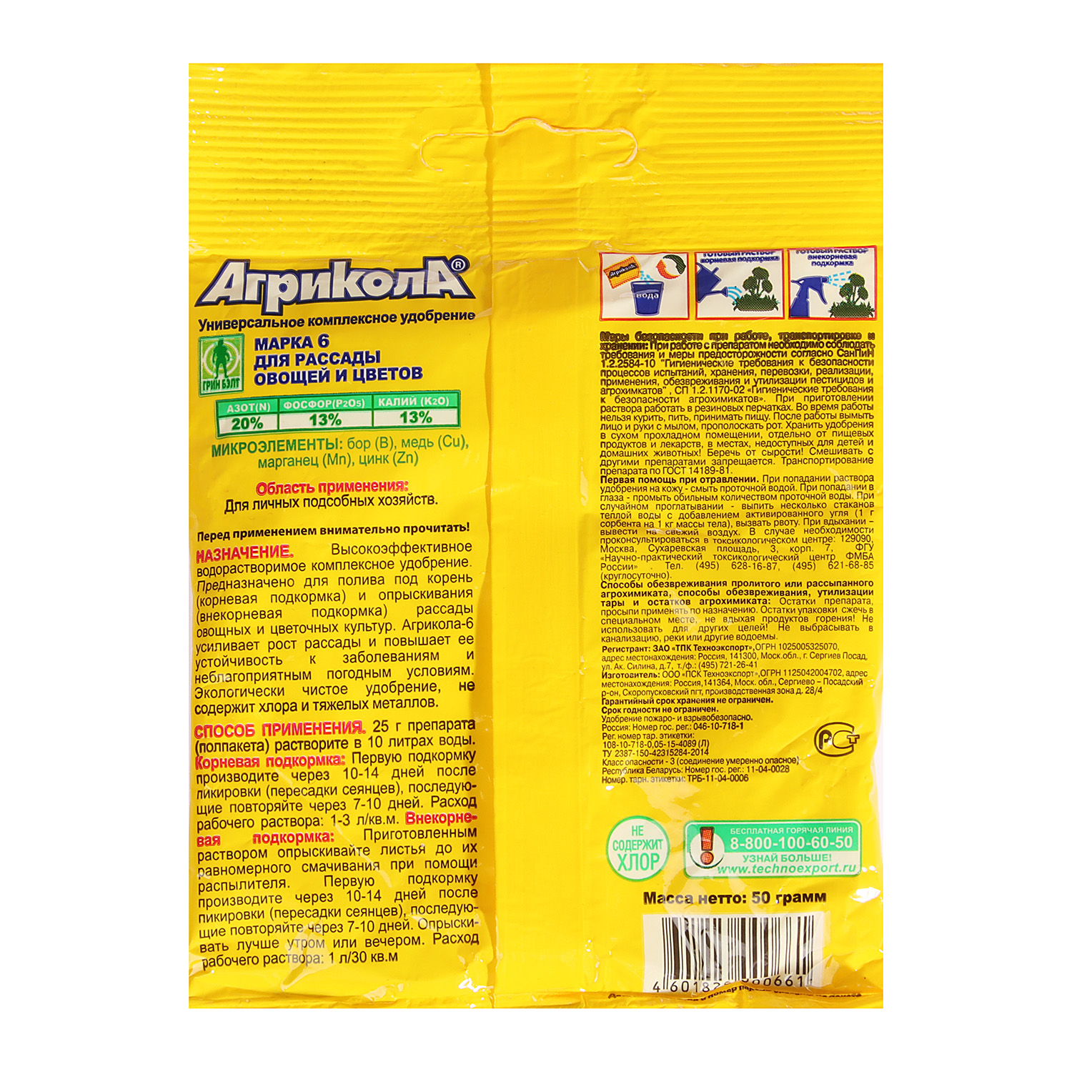 Удобрения включают полный сбалансированный набор макро- и микроэлементов, не содержат хлора и тяжелых металлов. Правильный состав, учитывающий потребности растения в тот или иной период роста, своевременные подкормки удобрениями Агрикола препятствуют образованию нитратов в растениях.