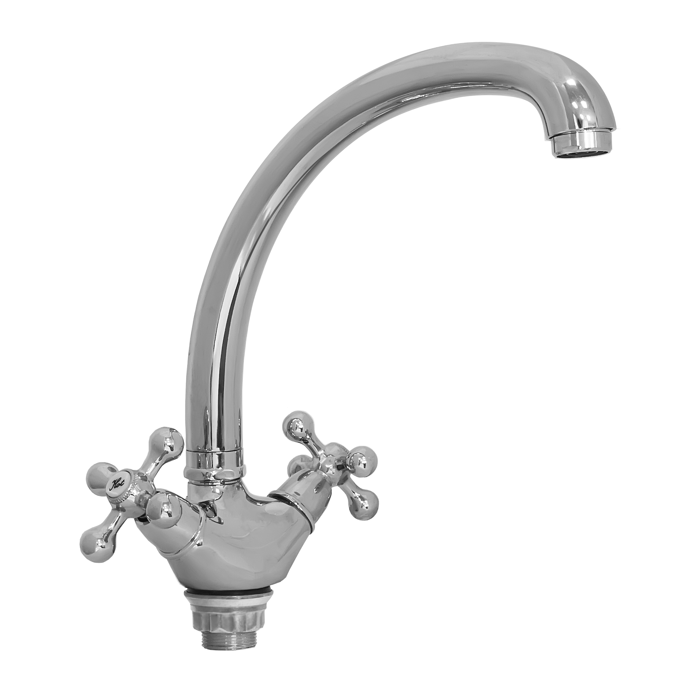Двухзахватный смеситель для кухни с крестообразными пластиковыми маховиками типа «P», усиленным корпусом и гобким изливом. Кран-буксы латунные с металлокерамическими запорными пластинами. Гибкий излив легко позволяет перенаправить струю в нужном направлении. Двухрежимный аэратор с вытяжным типом переключения потока струя/спрей поможет либо расширить площадь омываемой поверхности (режим «спрей», либо быстро набрать емкость (режим «струя»). Крепление к столешнице или мойке осуществляется на штуцер с помощью удобной комбинированной гайки с металлической резьбовой вставкой и прокладок. В комплект входит подводка длиной 30 см.