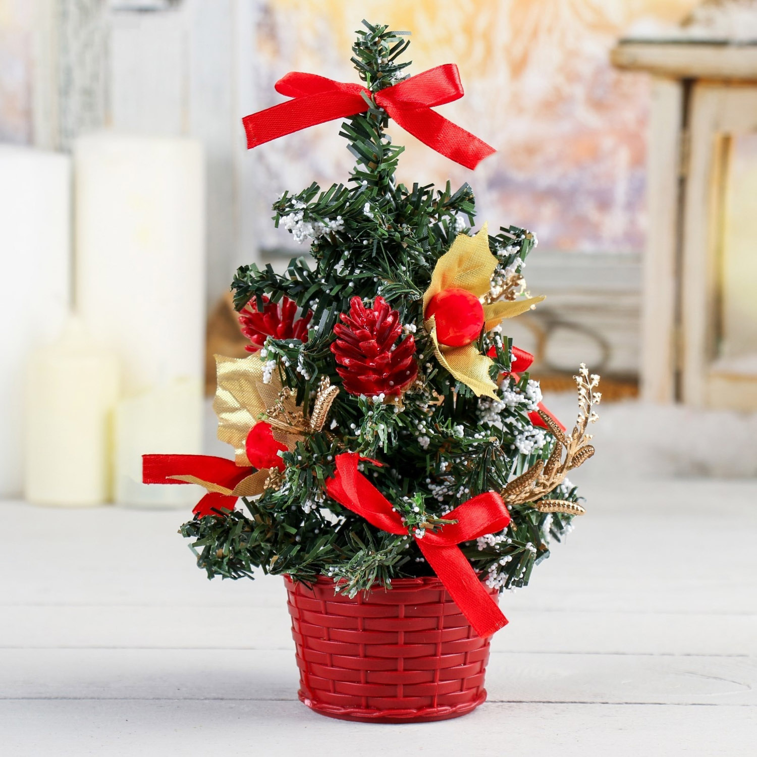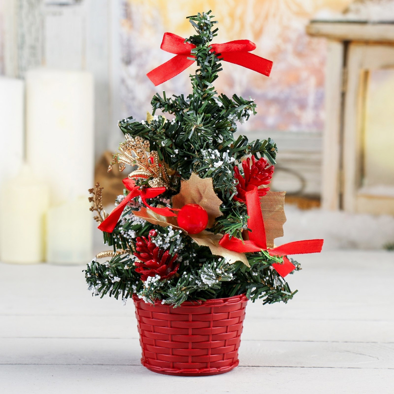 Декоративная елка Зимнее волшебство – прекрасное решение для символического оформления стола, тумбы или полки к Новому году. Компактная 20-сантиметровая елочка украшена различными декоративными элементами в красных оттенках и помещена в плетеную корзинку, поэтому деревце выглядит нарядно и празднично. Добавьте интерьеру новогоднего настроения вместе с декоративной елкой Зимнее волшебство!