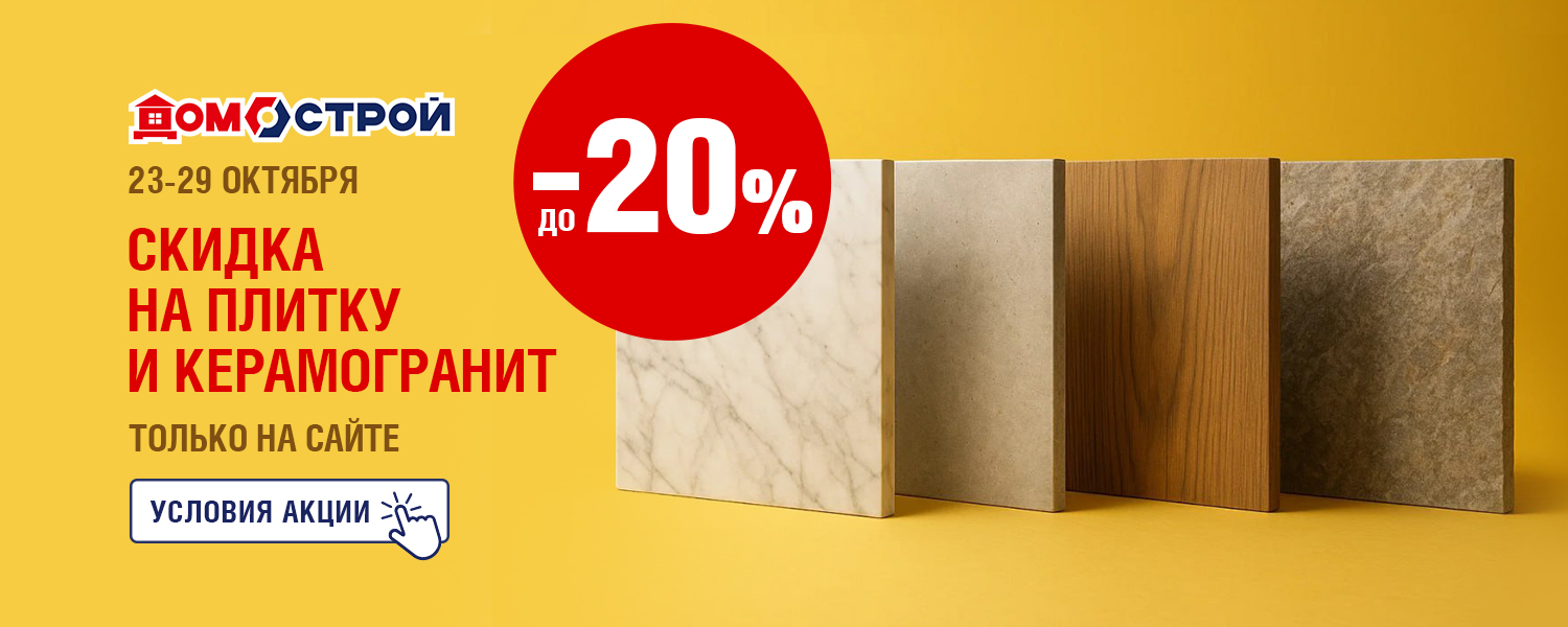 Онлайн-распродажа в сети ДомоСтрой! С 23 по 29 октября — скидка до 20% на плитку и керамогранит. Готовитесь к ремонту или мечтаете освежить интерьер? Не откладывайте — сейчас самое время сделать ремонт по отличным ценам!